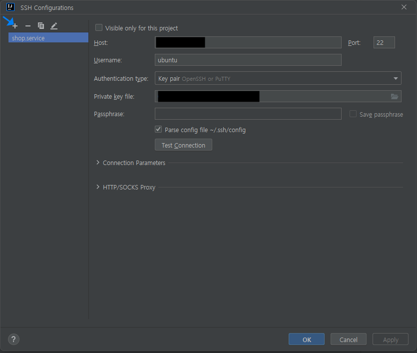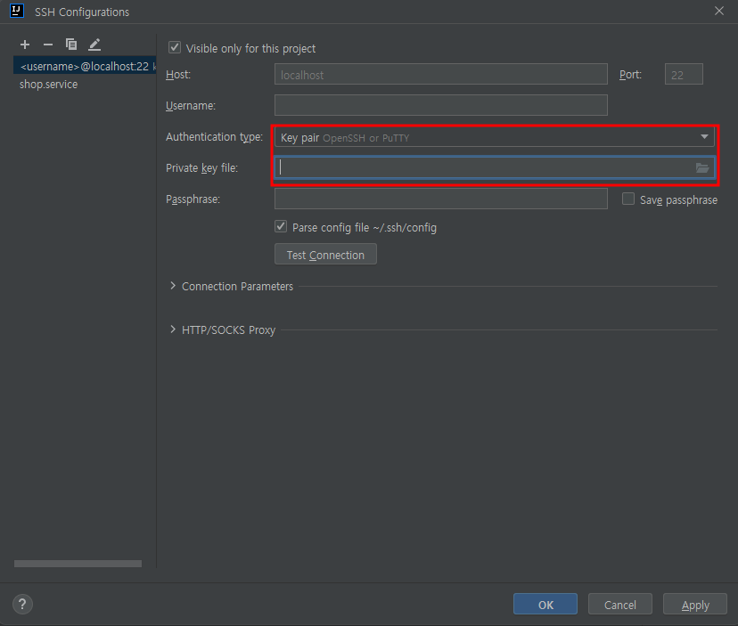 - Username : 접속하려는 서버의 username 작성 (ec2의 Ubuntu를 사용하는 경우 username은 ubuntu로...)