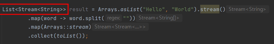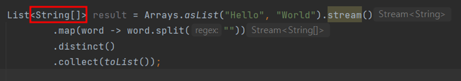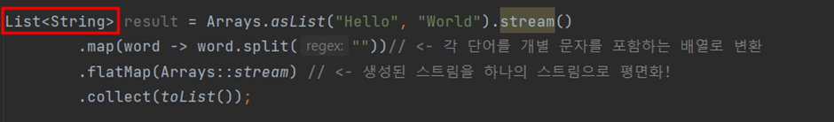 [H,e,l,l,o] , [W,o,r,l,d] 이렇게 결과가 생성된 것입니다. -> map의 결과가 Stream<String[]>…