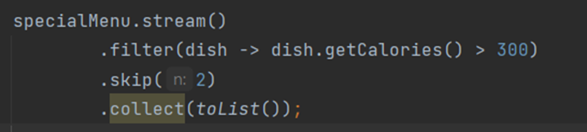 스트림은 처음 요소 n개를 제외한 스트림을 반환하는 skip(n) 메서드를 지원합니다.