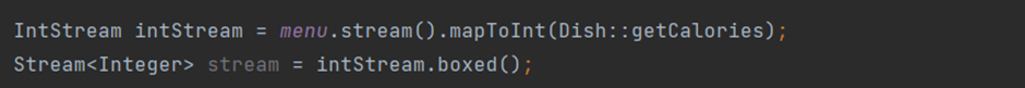 - IntSream, DoubleStream, LongStream은 기본형 특화 스트림 각각의 기본형에 특화된 연산 제공