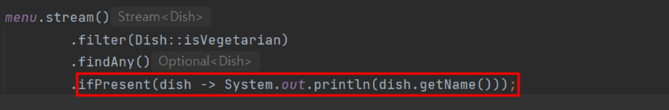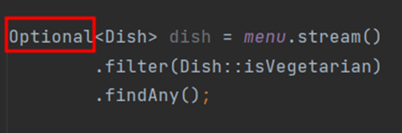이전 예제에서 findAny는 아무 요소도 반환하지 않을 수 있습니다. 결과를 단순히 null로 두게 되면 에러가 발생될 수 있으므로 자바 8 라이브러리에는 Optional<T>이라는 것이 추가된 것입니다.