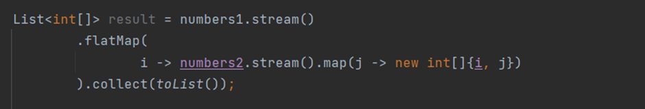 빨간색: numbser1의 숫자마다 map이 적용되어 반환되므로 요소가 Stream<int[]>인 새로운 데이터 소스 반환
