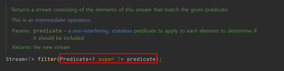 이렇듯 이 filter 메서드는 Predicate를 인자로 전달받아 조건에 부합하는 요소들을 Stream 형태로 반환합니다.