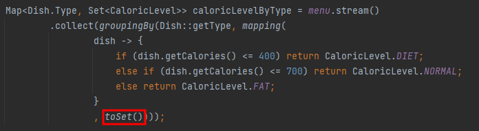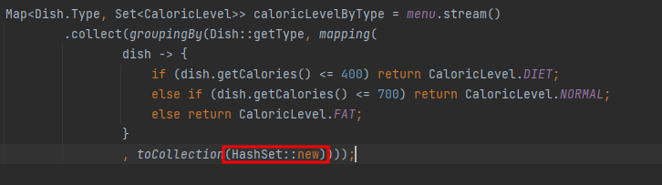 이제 만들어진 Collector를 사용해서 메뉴 스트림에서 Dish 리스트를 반환받을 수 있게 되었습니다.