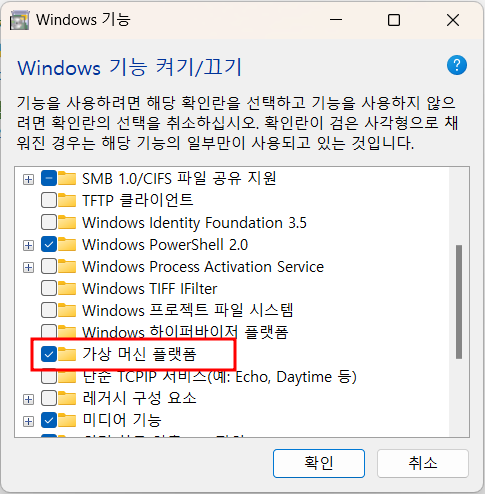 가상 머신 플랫폼 항목이 체크되어 있는지 확인해주세요.