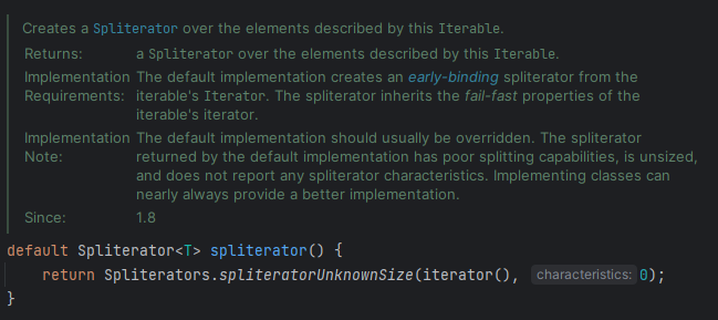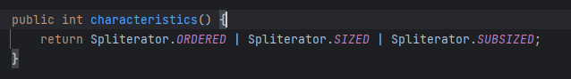 - characteristics - ORDERED + SIZED + SUBSIZED + NONNULL + IMMUTABLE - ORDERED(문자열의 문자 등장 순서가 유의미함), SIZED(estimatedSize 메서드의 반환값이 정확) - SUBSIZED(trySplit으로 생성된 Spliterator도 정확한 크기를 가짐), NONNULL(문자열에는 null 문자가 존재하지 않음) - IMMUTABLE(문자열 자체가 불변 클래스이므로 문자열을 파싱하면서 속성이 추가되지 않음) - 이렇듯 characteristics는 프레임워크에게 해당 Spliterator가 위의 특성을 가진다는 것을 알려주는 기능을 하는 메서드