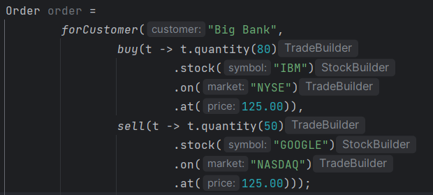 플루언트 방식을 사용한 메서드 체인 패턴과 중첩된 함수 패턴 그리고 람다 기법을 혼용한 결과입니다.
