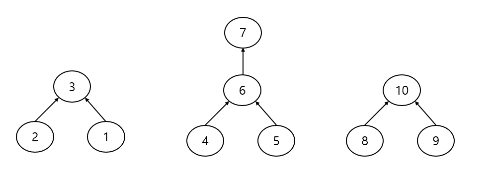 각 원소들을 트리로 묶어주는 방식으로 상호 배타적 집합을 표현합니다.
