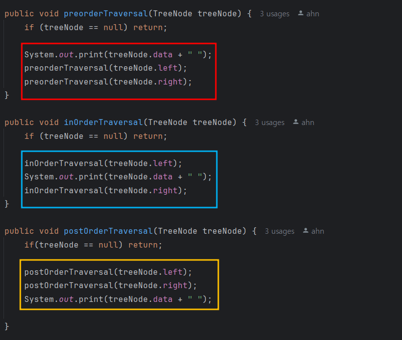- 전위 순회 : 현재 노드, 왼쪽, 오른쪽