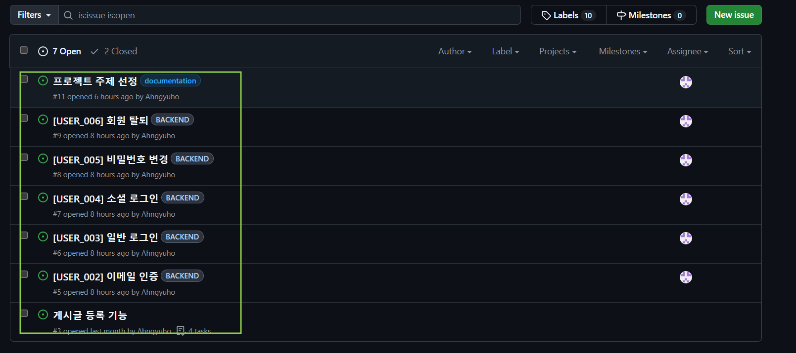 - 할당자(Assignees): 이 이슈를 해결할 담당자.