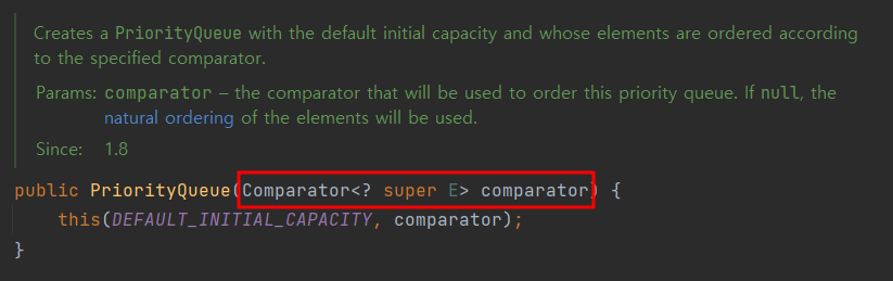PriorityQueue의 생성자 중에 이렇게 Comparator를 매개변수로 받는 생성자가 있는데 이 Comparator 객체를 하나 만들어 compare 함수를 구현한 것입니다.