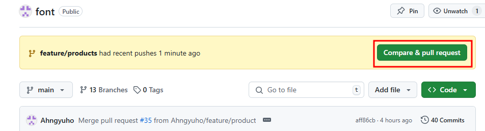 그런 다음 레포지토리로 돌아가서 pr 생성 화면으로 이동합니다.
