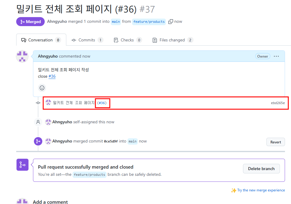 우선 이런 식으로 커밋된 내용들이 이슈 번호와 함께 나옵니다. 위에서 커밋 메시지를 작성할 때 이 커밋이 어떤 이슈와 관련된 것인지 명시해서 적어주었기 때문에 커밋과 이슈 번호가 같이 나옵니다.