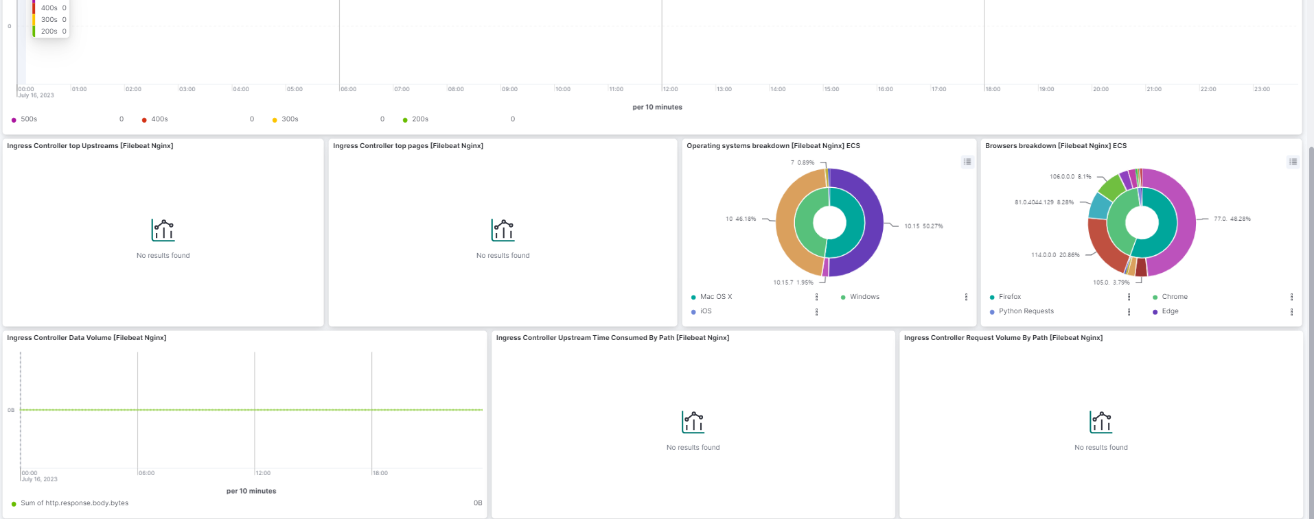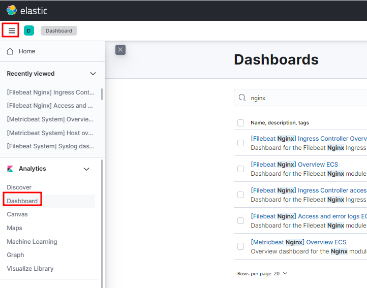 Kibana에서 Nginx 모듈을 활성화하면서 사용할 수 있게되는 대시보드들이 이렇게 나옵니다.