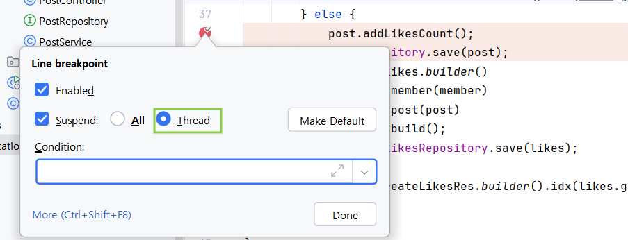 그리고 인텔리제이의 디버깅 시스템을 이용해서 각 스레드별 브레이크 포인트 실행