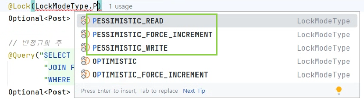 - PESSIMISTIC_READ → 다른 트랜잭션이 읽기/쓰기 모두 불가능