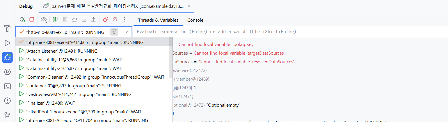 그리고 인텔리제이의 디버깅 시스템을 이용해서 각 스레드별 브레이크 포인트 실행