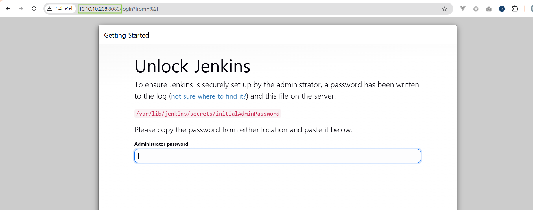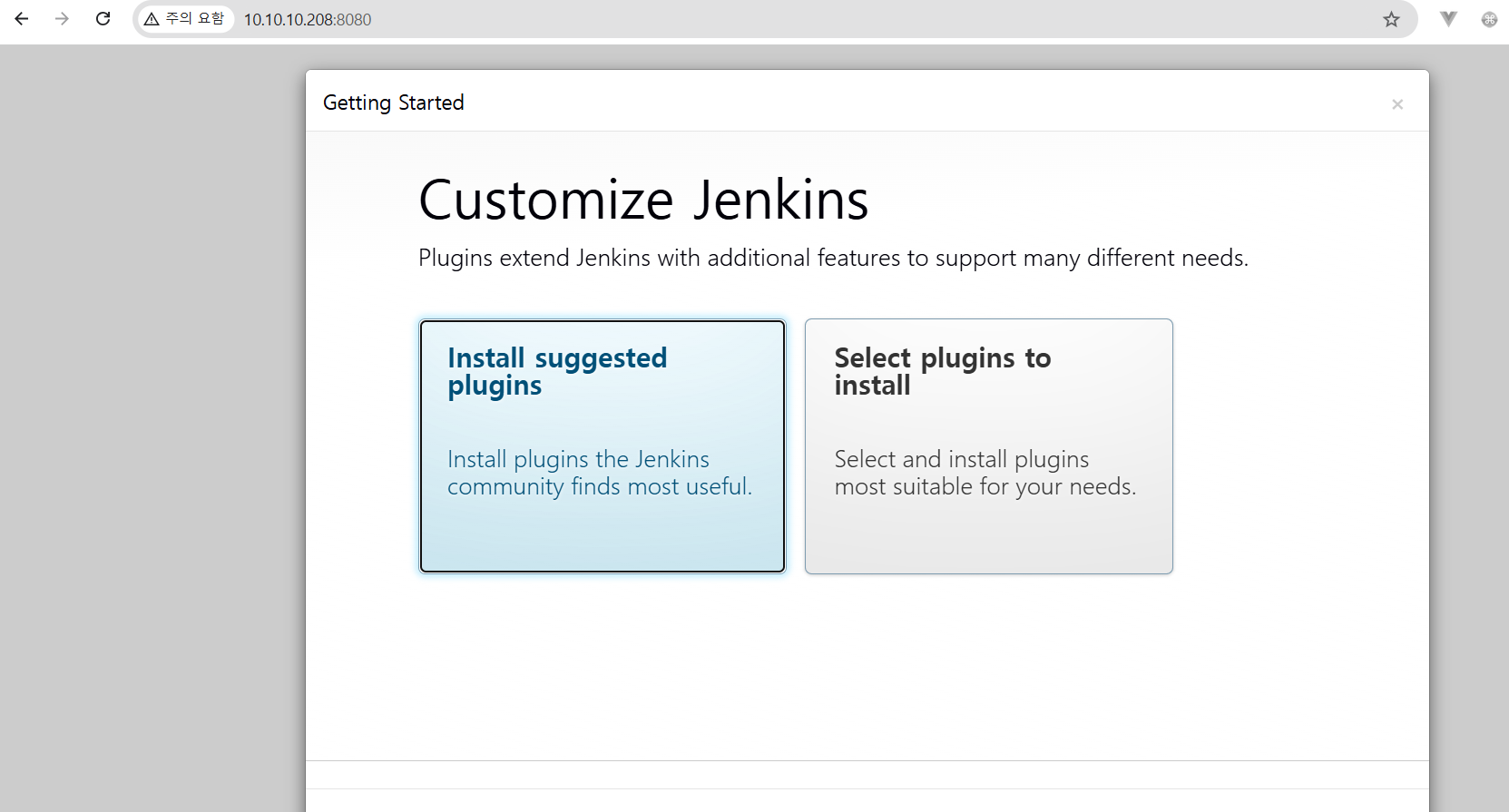 cat /var/lib/jenkins/secrets/initialAdminPassword 으로 초기 패스워드 확인 및 대시보드에 접속해서 입력