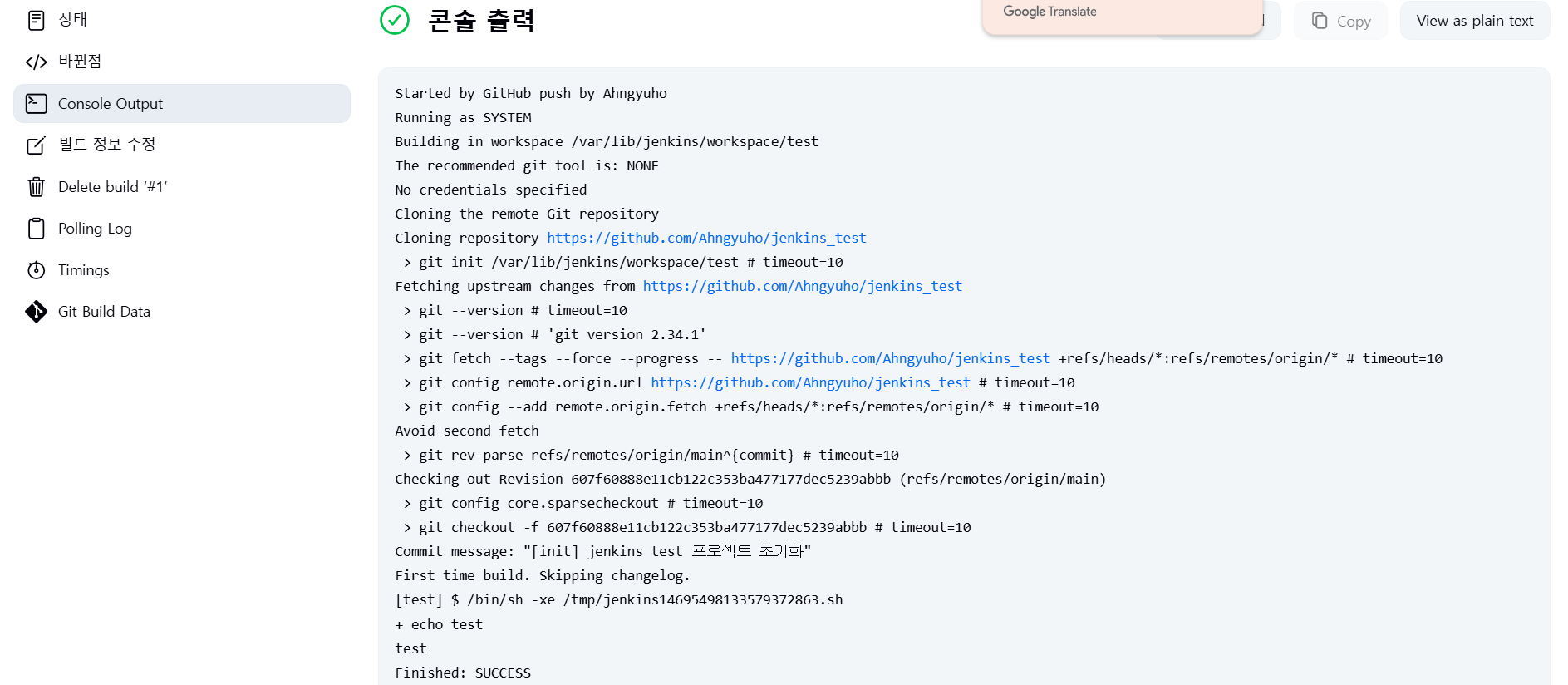 -> Triggers에서 GitHub hook trigger for GITScm polling 체크 -> Build Steps에서 Add build step 클릭 후 Execute shell클릭 후 echo test 입력 -> 저장