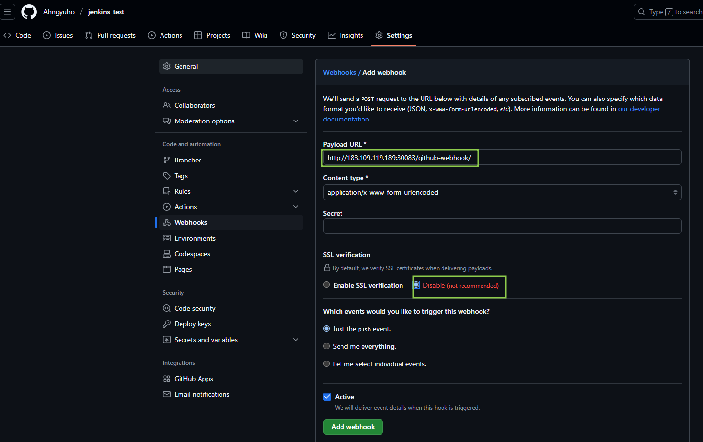 Payload URL : http://183.109.119.189:100/github-webhook/